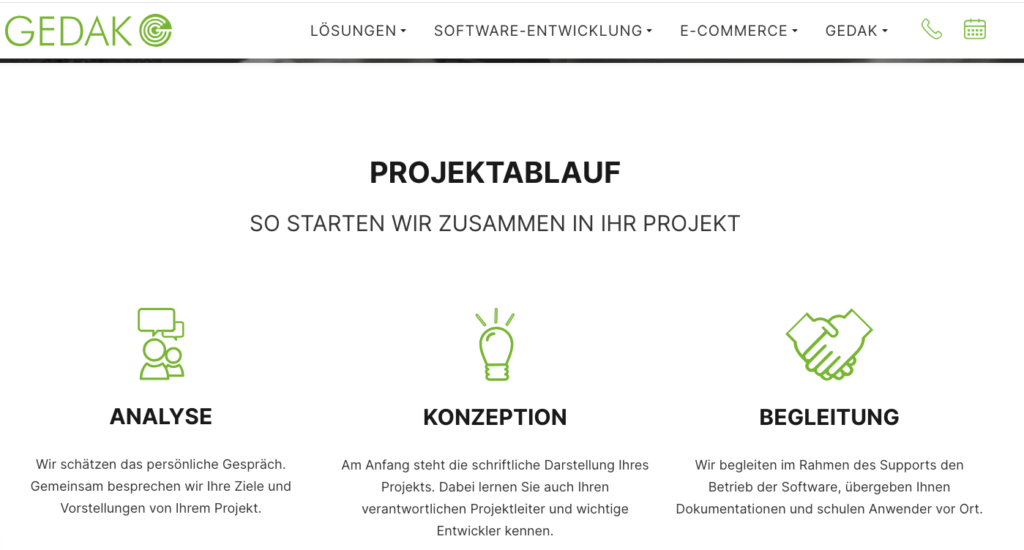 Hier ein Beispiel für einen 3-Schritte-Ablauf von der Startseite der IT-Firma Gedak (www.gedak.de, Stand: 25.09.2025, unbezahlte Werbung)